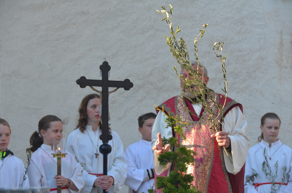 Pfarrer Dr. Hüttl segnete die mitgebrachten Palmzweige, bestehend aus Weidenkätzchen, und hatte auch einige echte Ölzweige dabei. Die freiwilligen Spenden dafür kommen Christinnen und Christen in Palästina zugute, die aktuell unter schweren, unmenschlichen Bedingungen leben müssen.