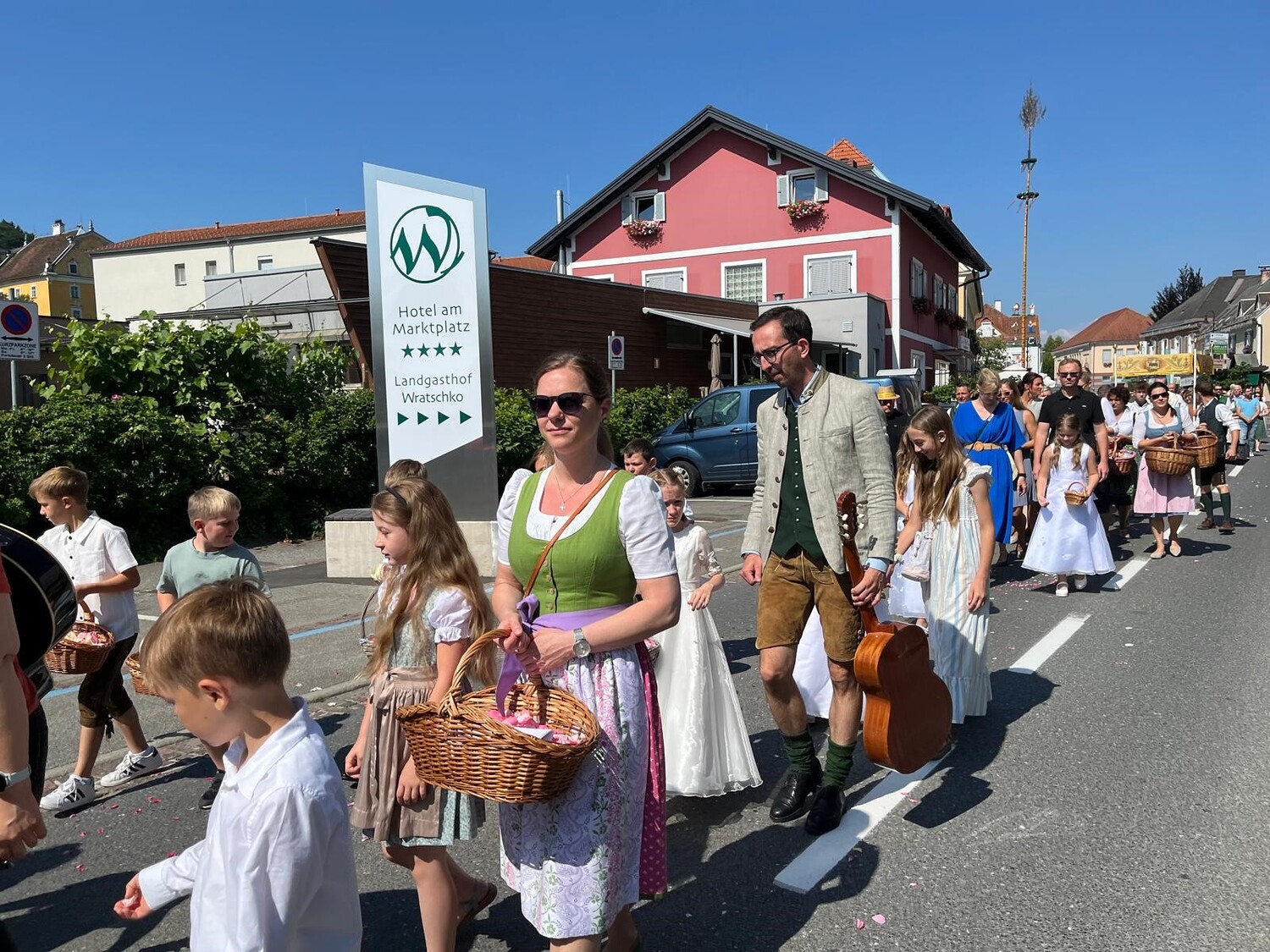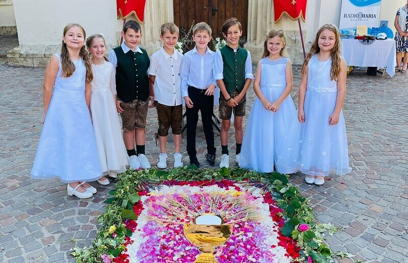 Danke auch allen Eltern für den wun­der­schö­nen Blu­men­tep­pich vor der Kir­che und die Be­glei­tung der Kin­der zu die­sem Hoch­fest.